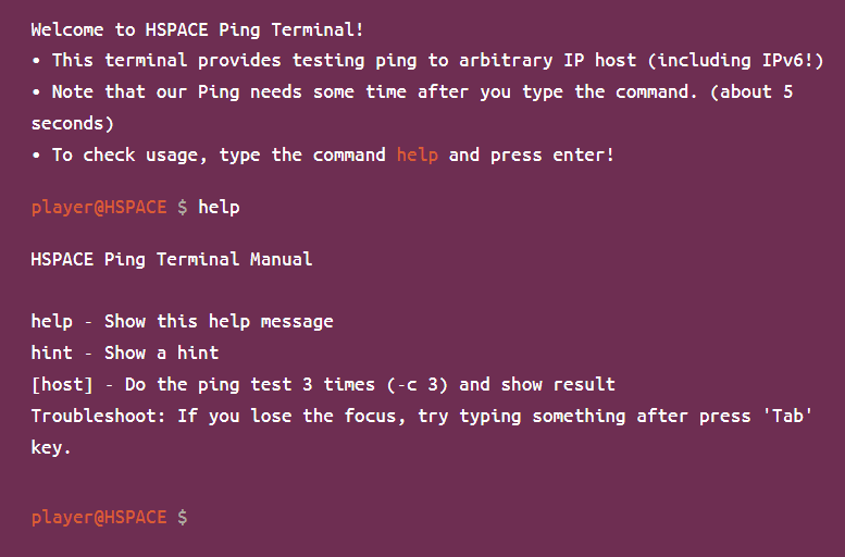 <span class="orange">player@HSPACE</span> <span class="grey">$</span> <span class="user-input">help</span><textarea id="user-text" autofocus></textarea>