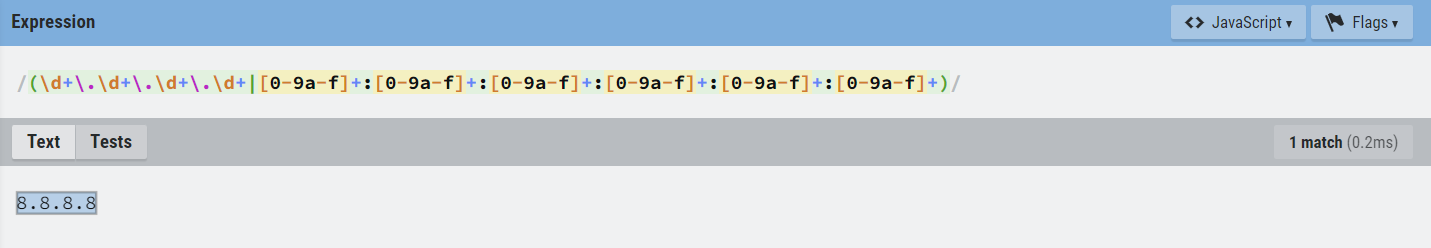 if(!preg_match("/(\d+\.\d+\.\d+\.\d+|[0-9a-f]+:[0-9a-f]+:[0-9a-f]+:[0-9a-f]+:[0-9a-f]+:[0-9a-f]+)/", $t)){