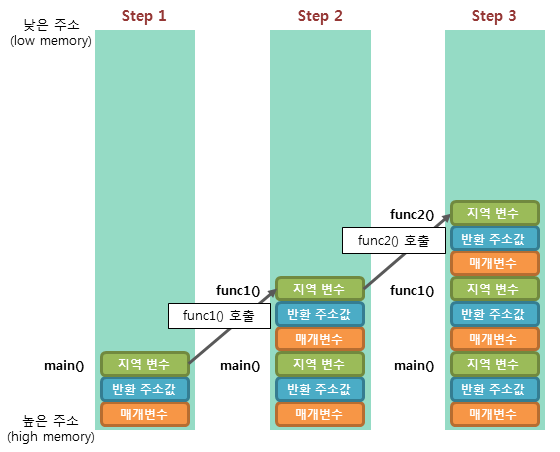 Step 2. func1() 함수를 호출하면 해당 함수의 매개변수, 반환 주소값, 지역 변수 등의 스택 프레임이 스택에 저장된다.