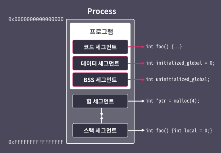 | 코드 세그먼트 | 실행 가능한 코드가 저장된 영역 | 읽기, 실행 | main() 등의 함수 코드 |
