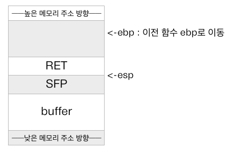 buffuer overflow 기법을 사용하여 복귀 주소가 저장된 스택 메로리를 의도적으로 다른 값으로 변경할 수 있다.