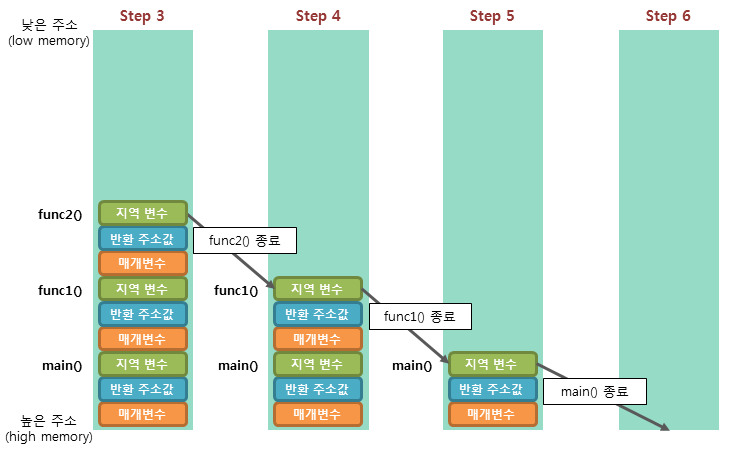 Step 5. func1() 함수의 호출이 종료되면, func1() 함수의 스택 프레임이 스택에서 제거된다.
