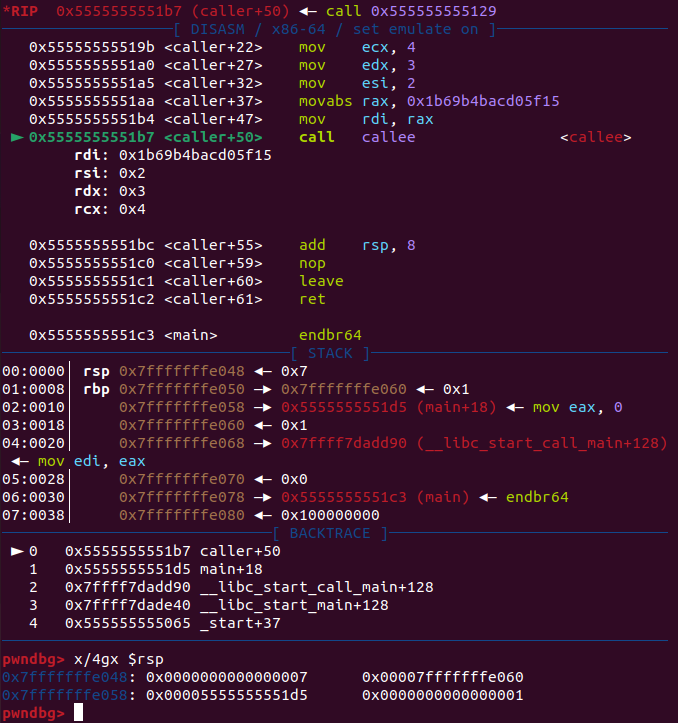 call  실행 후 스택에 저장된 반환 주소 0x5555555551bc = callee 호출 다음 명령어의 주소