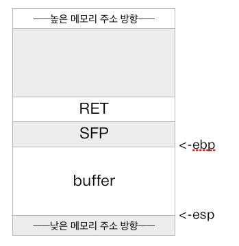 스택은 Buffer + SFP (4 Byte) + RET (4 Byte) 구조로 이루어져 있다.