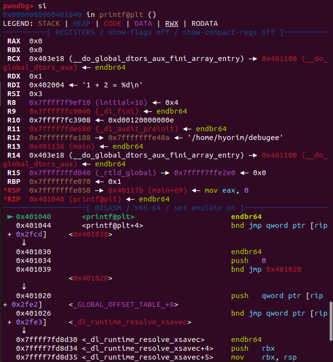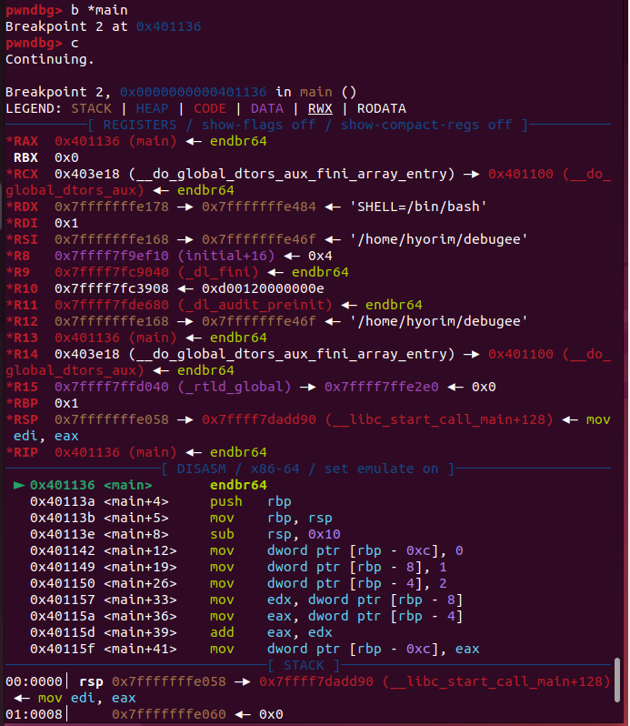 Context는 REGISTERS, DISASM, STACK, BACKTRACE (현재 rip에 도달할 때까지 어떤 함수가 중첩되어 호출됐는지) 총 4개의 영역으로 구분한다.