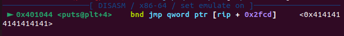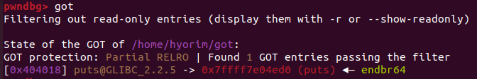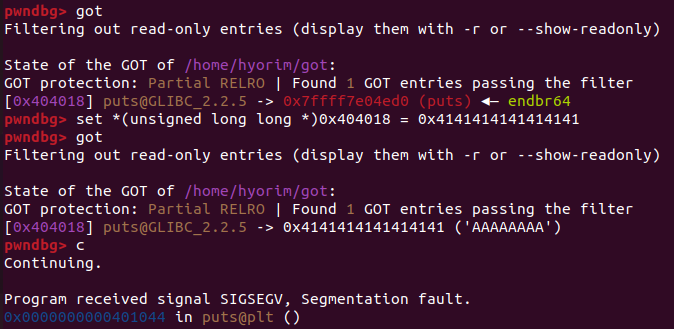 got 바이너리에서 main() 내 두번째 puts 호출 직전에 puts GOT 엔트리를 "AAAAAAAA"로 변경하고 실행하면 실제 실행 흐름이 "AAAAAAAA"로 옮겨진다.