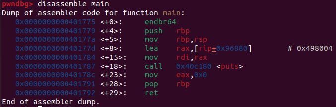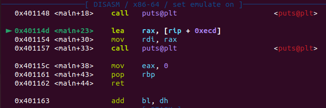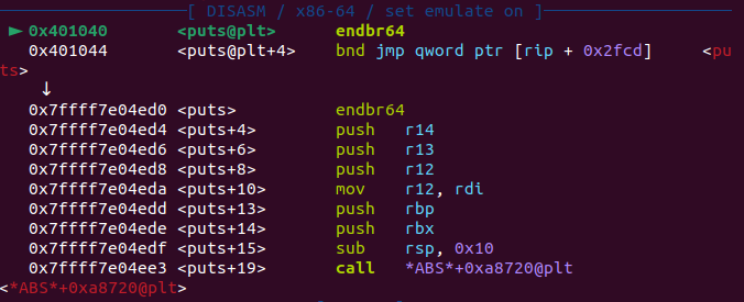 main()에서 puts@plt 호출하는 지점에 종단점 설정하고 내부로 따라간다.