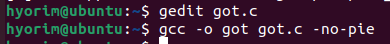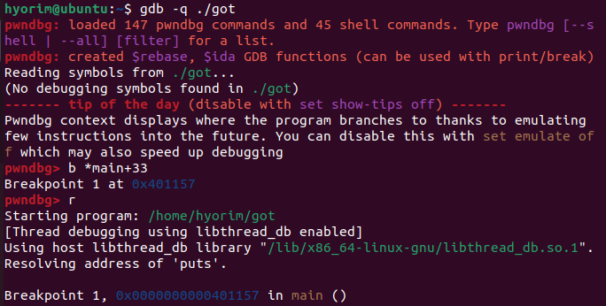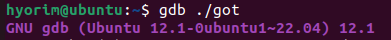 GOT 엔트리에 저장된 값을 임의로 변조할 수 있는 수단이 있다고 가정하고 gdb로 실험을 해보자.