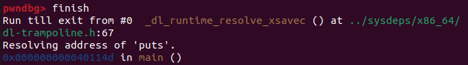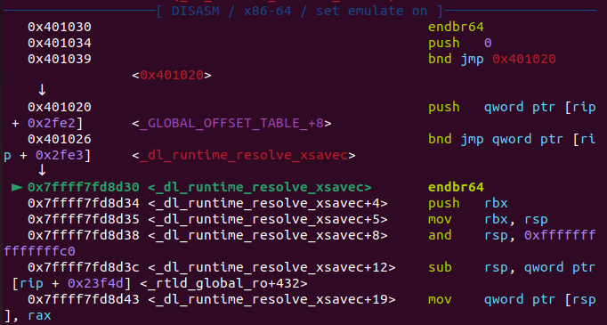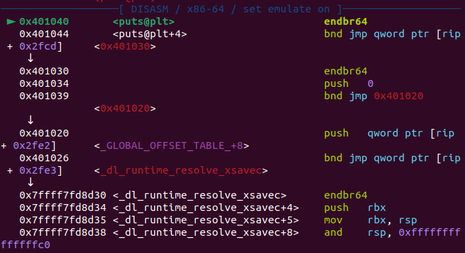 실행 흐름을 따라가면 puts 주소를 구하고, GOT 엔트리에 주소를 쓰는 함수 _dl_runtime_resolve_fxsave가 호출될 것이다.