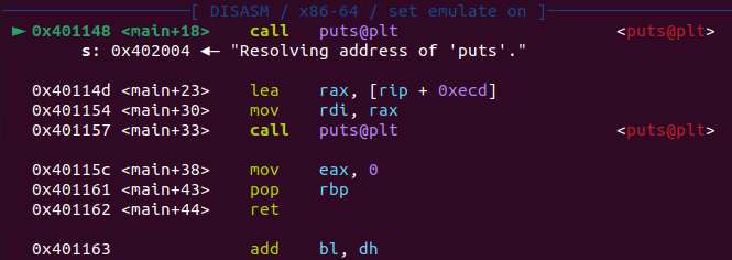 puts("Resolving address of 'puts'.");