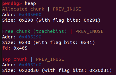 0x405000: tcache_perthread_struct 구조체, libc 단에서 힙 영역 초기화할 때 할당하는 청크