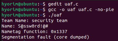 free는 해제한 메모리의 데이터를 초기화하지 않으므로, nametag에는 secret의 값 일부가 남아있게 된다.