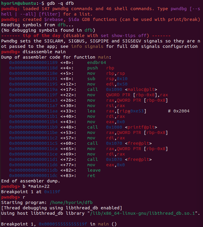tcache 도입 당시와 다르게 glibc에 보호 기법이 구현되어 우회 없이 같은 청크를 두번 해제하는 즉시 프로세스가 종료된다.