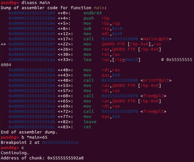 chunk가 tcache에 중복 연결되어 연속으로 재할당되는 것을 확인할 수 있다.
