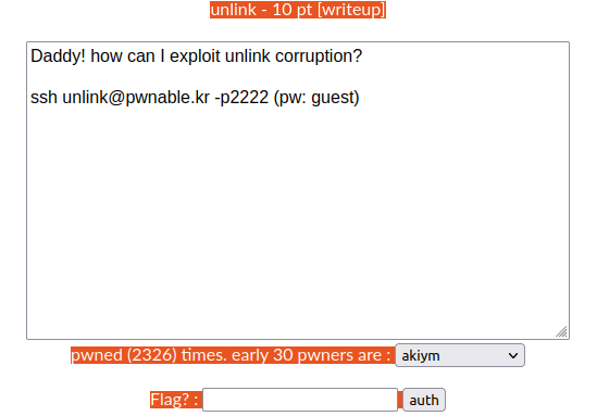 s = ssh(user="unlink",host="pwnable.kr",port=2222,password="guest")