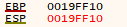 ESP = 19FF14, 주소 값은 401041입니다. 이 값은 앞 CALL 401000 명령에서 CPU가 스택에 입력한 복귀 주소입니다.