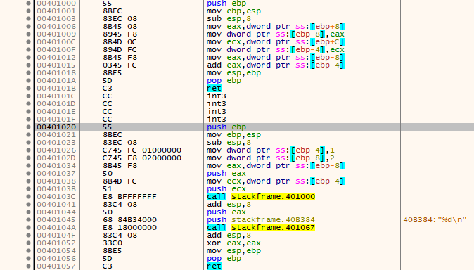 이제 add() 함수의 스택 프레임이 생성되었습니다. add() 함수 내에서 EBP 값은 고정됩니다.
