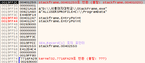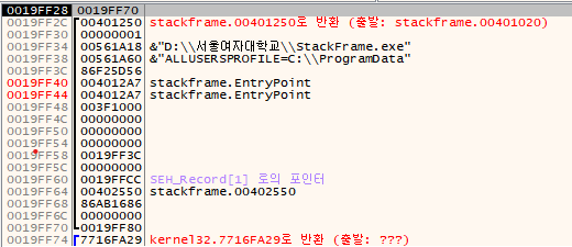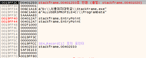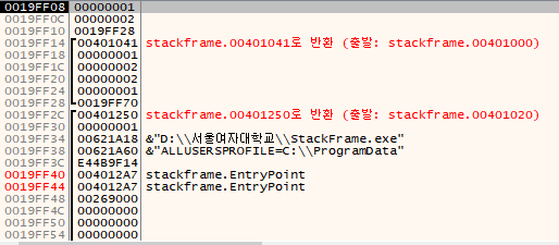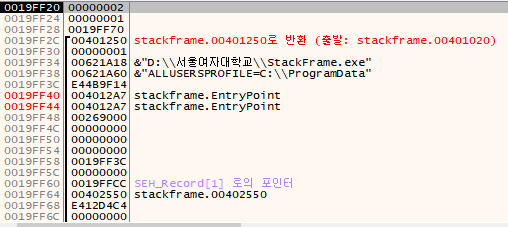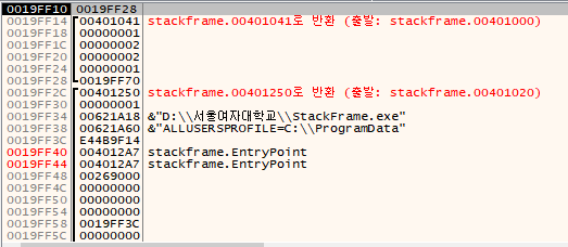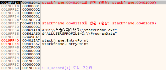 현재 ESP = 19FF2C, EBP = 19FF70 입니다. ESP에 저장된 값 401250은 main() 함수의 실행이 끝난 후 돌아갈 리턴 주소(Return Address)입니다.