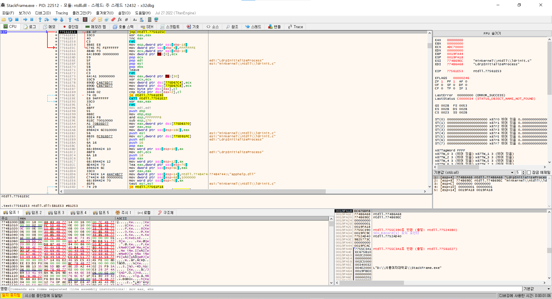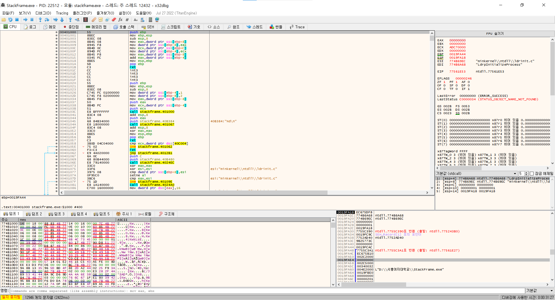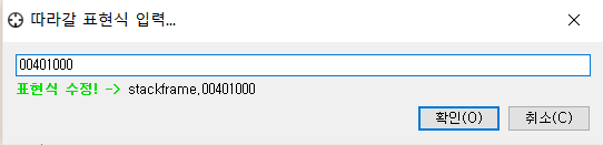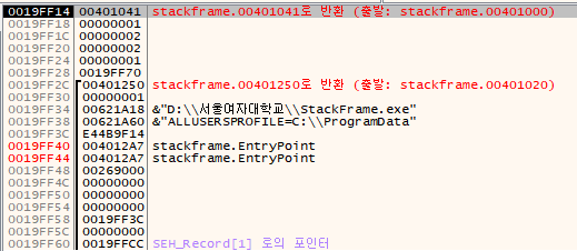 OllDbg로 StackFrame.exe 파일을 열고 401000 주소로 이동합니다. (Go to 명령어 사용[Ctrl+G])