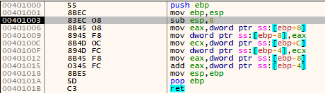 add() 함수는 파라미터로 a와 b를 받습니다. 위 401034~40103B 주소의 코드에서는 변수 a와 b를 스택에 넣고 있습니다.