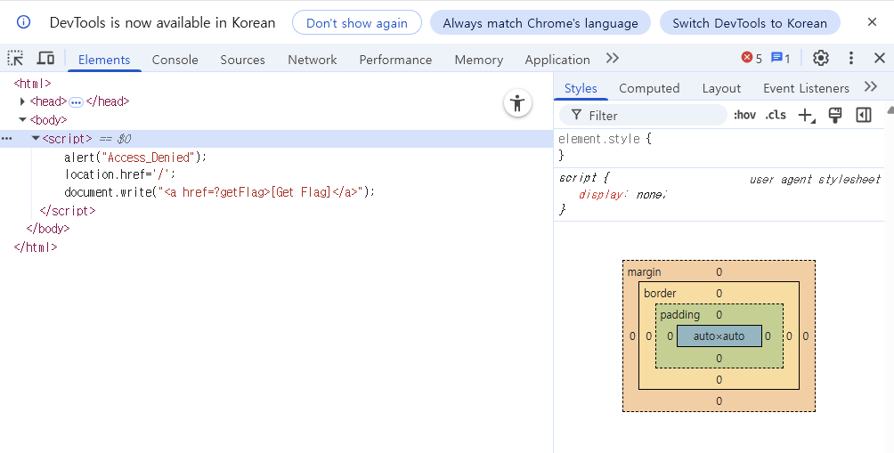 그 다음은 document.write() 로 페이지에 링크를 쓰는 코드가 있습니다만, [Get Flag] 링크가 만들어지긴 하지만 / 페이지로 리다이렉트되니 실행 결과를 볼 수 없었던 것 같습니다.