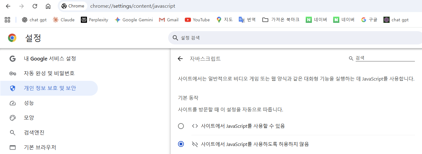 설정 - 개인 정보 보호 및 보안 - 사이트 설정 - 하단에 콘텐츠 - 자바스크립트 - 사이트에서 'JavaScript를 사용하도록 허용하지 않음' 선택
