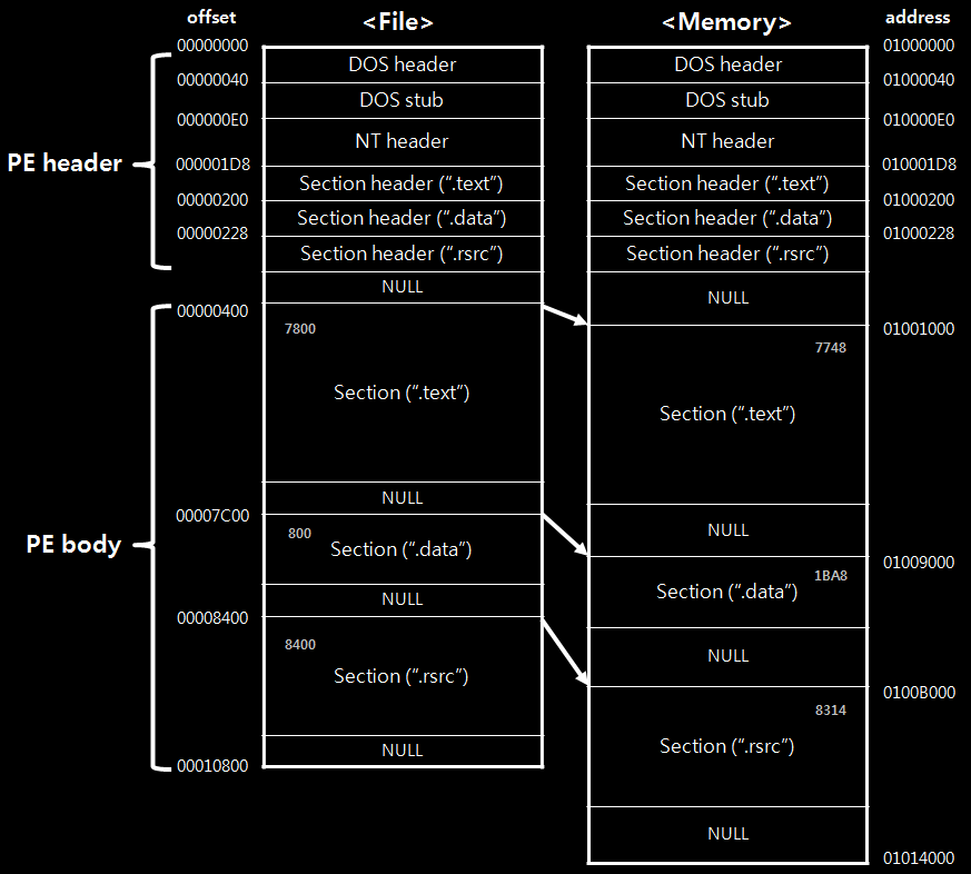 RVA to RAW란 PE File이 메모리에 로딩되었을 때, 각 Section에서 16진수의 Memory 주소(RVA)와 File Offset을 매핑(Mapping)하는 과정이다. 여기서 RAW는 File Offset을 의미한다.