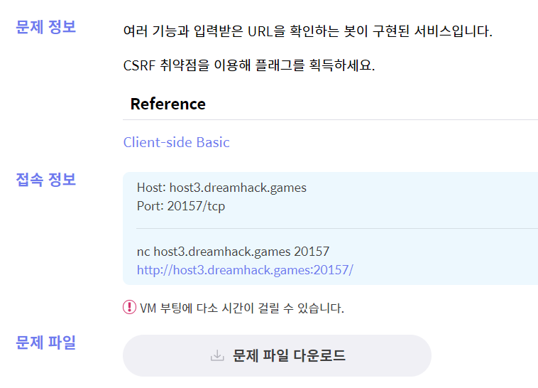 여러 기능과 입력받은 URL을 확인하는 봇이 구현된 서비스입니다. CSRF 취약점을 이용해 플래그를 획득하세요. Reference Client-side Basic