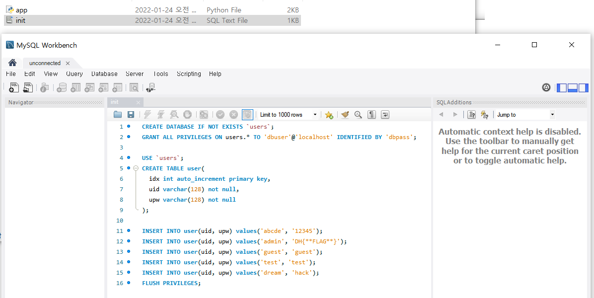 데이터베이스의 초기값을 확인해보면 “admin” 계정의 패스워드를 획득하는 것이 문제의 목표임을 알 수 있다.