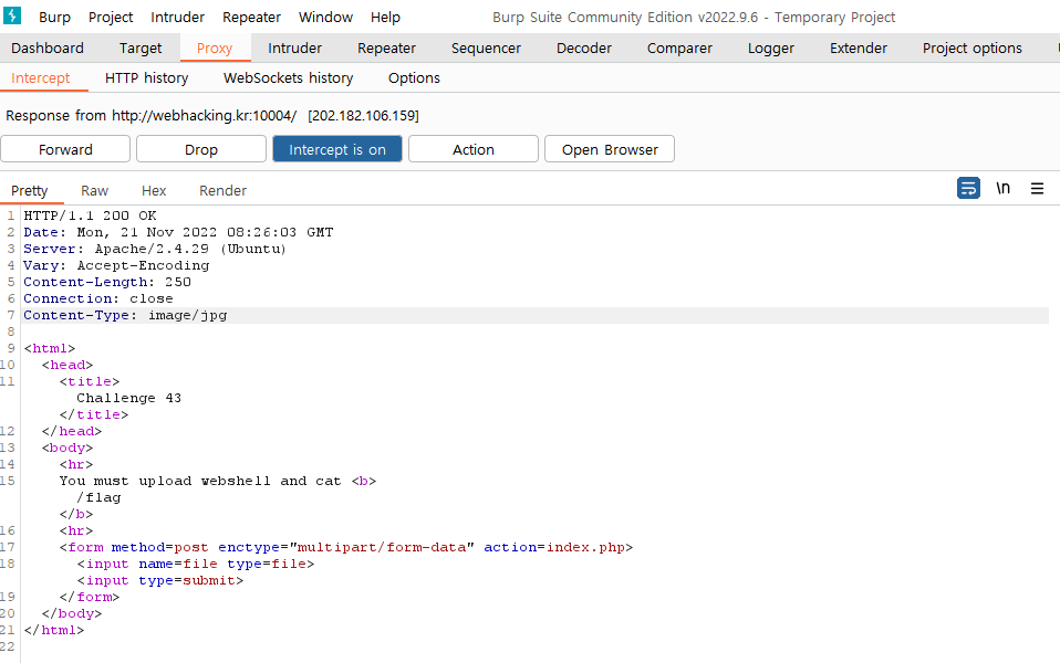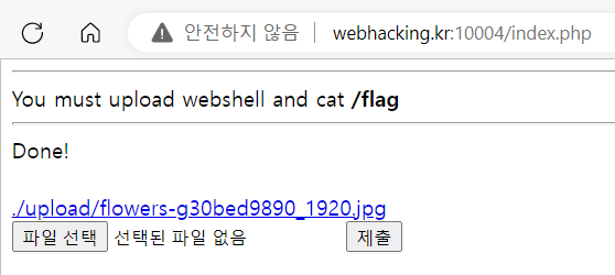 저렇게 Content-Type을 jpg, jpeg, png 뭐든 바꾸어주고 php 파일을 업로드하면 이미지 파일로 되어서 flag를 출력할 수 있어야 한다.