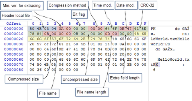 Local File Header 시그니처, 압축 전 파일 크기, 압축 후 파일 크기, 파일 최종 수정 시간, 파일 최종 수정 날짜, CRC-32정보, 파일 이름, 파일 이름 길이 등등이 포함된다.