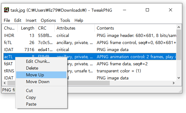 그럼 APNG 파일 청크를 다음과 같은 순서로 정렬해준다.