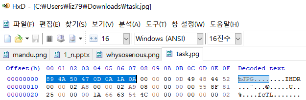 근데 푸터 시그니처는 PNG의 49 45 4E 44 AE 42 60 82 와 JPEG의 FF D9 가 붙어있는 것이다.