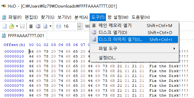 다운받은 파일을 HxD로 열어서 위와 같이 [ 도구 -> 디스크 이미지 열기 -> 512 ]를 선택하면
