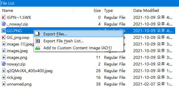 아까 있던 그림 파일들 중 GG.png 파일을 Export Files 기능을 이용해 추출해준다.