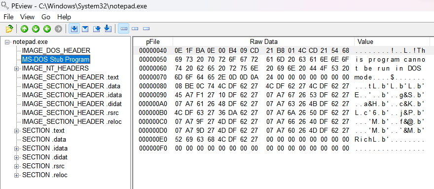 즉, notpad.exe는 32 bit 용 PE 파일이지만, MS-DOS 호환 모드를 가지고 있어서 DOS 환경에서 실행하면 "This program cannot be run in DOS mode" 문자열을 출력하고 종료한다.