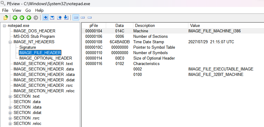 | [ IMAGE_FILE_HEADER ] - notepad.exe offset value description ------------------------------------------------------------------------------- 000000E4 014C machine 000000E6 0003 number of sections 000000E8 48025287 time date stamp (Mon Apr 14 03:35:51 2008) 000000EC 00000000 offset to symbol table 000000F0 00000000 number of symbols 000000F4 00E0 size of optional header 000000F6 010F characteristics IMAGE_FILE_RELOCS_STRIPPED IMAGE_FILE_EXECUTABLE_IMAGE IMAGE_FILE_LINE_NUMS_STRIPPED IMAGE_FILE_LOCAL_SYMS_STRIPPED IMAGE_FILE_32BIT_MACHINE |
