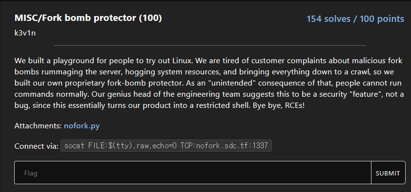 Connect via: socat FILE:$(tty),raw,echo=0 TCP:nofork.sdc.tf:1337