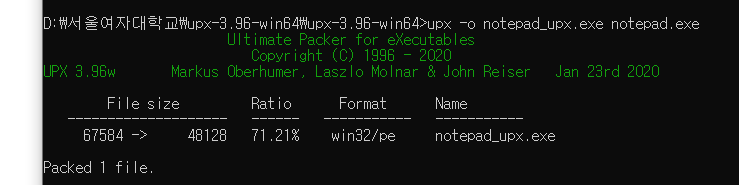 - PE 파일을 대상으로 파일 내부에 압축해제 코드를 포함하고 있어서 실행되는 순간에 메모리에서 압축을 해제시킨 후 실행시키는 기술