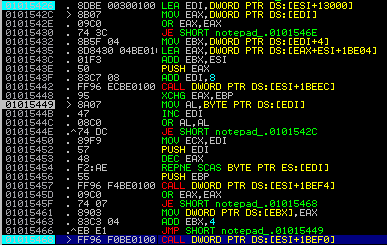 더 내려가다 보면 위와 같은 네번째 루프가 나타난다. 이 부분이 바로 IAT를 세팅하는 루프이다. 일반적인 실행 압축 파일은 원본 파일의 코드, 데이터 ,리소스의 압축 해제 과정이 끝나면 IAT를 세팅하고 OEP로 간다. 01015426 주소에서 EDI는 01014000으로 세팅되고, 이곳이 두번째 섹션영역이다.