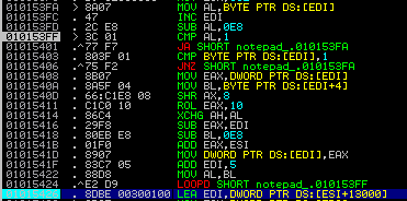 두번째 루프문은 이전보다 꽤 길다. 두번째 루프가 본격적인 디코딩 루프, 또는 압축해제 루프라고 할 수 있다. ESI가 가리키는 두번째 섹션의 주소에서 차례대로 값을 읽어서 적절한 연산을 거쳐 압축을 해제하여, EDI가 가리키는 첫번째 섹션의 주소에 값을 써주는 형식으로 돌아가고 있다. 위에서 AL(EAX)에는 압축 해제된 데이터가 있고, EDI는 첫번째 섹션의 주소를 가리키고 있다.