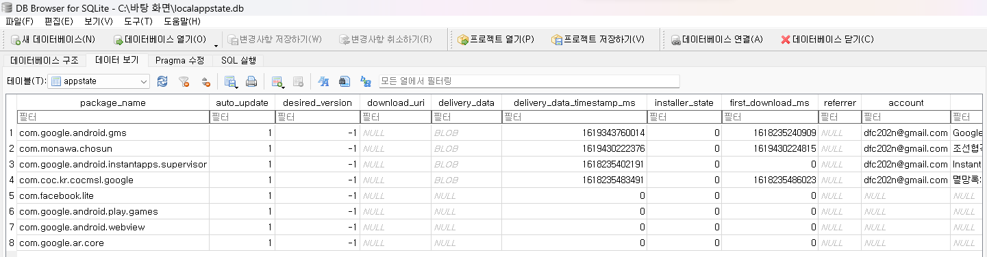주어진 localappstate.db 파일 내 appstate 테이블중 account 칼럼을 확인해 보면 dfc202n@gmail.com 이라는 구글 계정을 확인할 수 있다.