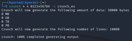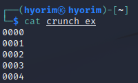 crunch [최소 자릿수] [최대 자릿수] [사용할 문자] -o [저장할 파일명]