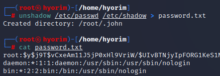 unshadow 명령어로 /etc/passwd 와 /etc/shadow 를 합쳐 password.txt 파일에 저장한다.