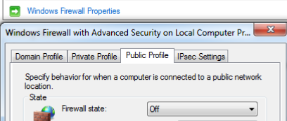 Windows Firewall Propeties 옵션에서 Domain Profile, Private Profile, Public Profile 전부 Off.
