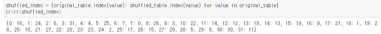 shuffled_index = {original_table.index(value): shuffled_table.index(value) for value in original_table}
