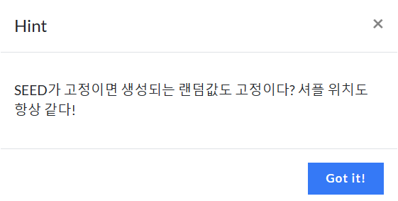 그리고 셔플한 결과값이 '\x0ea3\x1dq\x98\n\xab\xf9\xec\x95\xd4#\x8d+-,\xa7\x9d\x85\xd1\xf1\xa0\xbb\x89z\xc9\x83\x19\xb3\x91Z'와 같으면 flag를 맞혔다는 것이다.