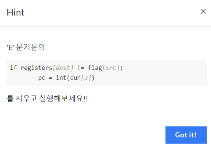 그리고 이 명령어는 바로 위의 코드에서 registers[0] != flag[0] 일 때 출력되는 104번째 값이다.