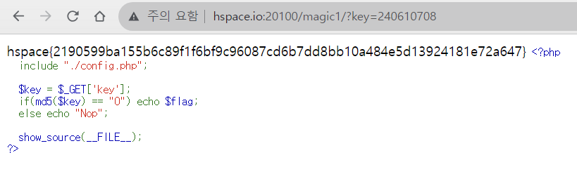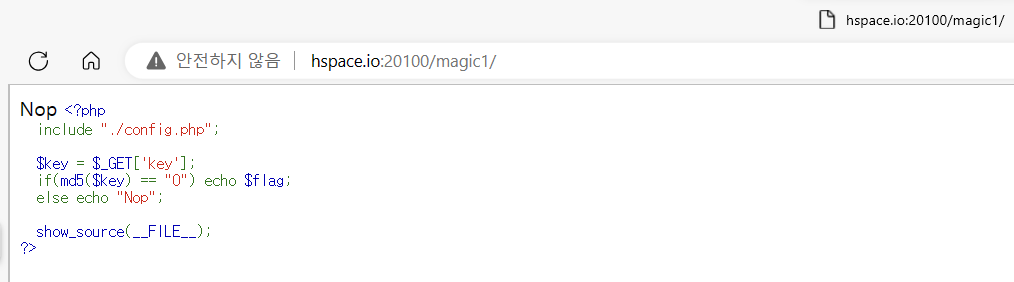 <span style="color: #0000BB"><?php<br /> </span><span style="color: #007700">include </span><span style="color: #DD0000">"./config.php"</span><span style="color: #007700">;<br /><br /> </span><span style="color: #0000BB">$key </span><span style="color: #007700">= </span><span style="color: #0000BB">$_GET</span><span style="color: #007700">[</span><span style="color: #DD0000">'key'</span><span style="color: #007700">];<br /> if(</span><span style="color: #0000BB">md5</span><span style="color: #007700">(</span><span style="color: #0000BB">$key</span><span style="color: #007700">) == </span><span style="color: #DD0000">"0"</span><span style="color: #007700">) echo </span><span style="color: #0000BB">$flag</span><span style="color: #007700">;<br /> else echo </span><span style="color: #DD0000">"Nop"</span><span style="color: #007700">;<br /><br /> </span><span style="color: #0000BB">show_source</span><span style="color: #007700">(</span><span style="color: #0000BB">__FILE__</span><span style="color: #007700">);<br /></span><span style="color: #0000BB">?></span>